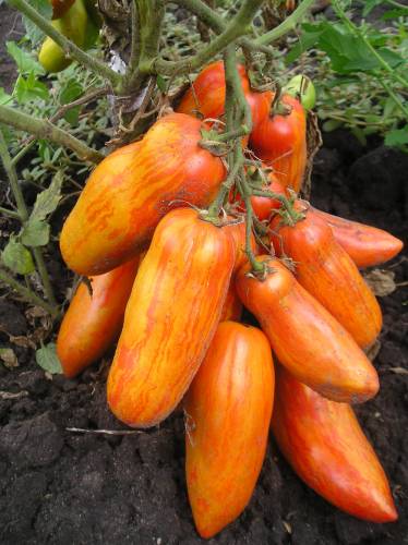Перцевидный полосатый Низкорослый, штамбовый сорт. Плоды пулевидной формы красные в полосочку , очень мясистые. Сорт обеспечивает стабильно высокий урожай при различных неблагоприятных условиях. Прекрасно подходит для цельного консервирования.
